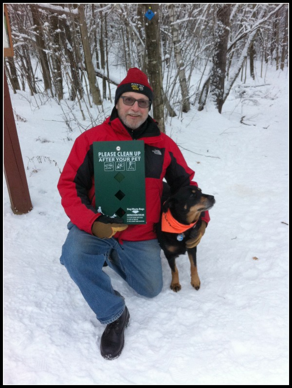 After posting educational signs at their trailheads and not seeing much change, the land trust is trying a new approach to improving the situation this winter. With the help of a few dog-loving volunteers, pet waste bags are now available at both trailheads and volunteer “Poo Crews” will be tracking and promoting picking up and packing out waste through next spring. Volunteer Sheila Goss who hikes at Kirchner Woods with her dog Gryphon a few times a week says that helping out on the Poo Crew is the least she can do. “I hope that people understand that this effort is to benefit all of us, human and canine” says Goss.