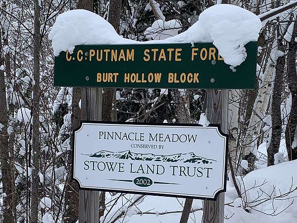 - Option to continue up to the Stowe Pinnacle summit: from the meadow follow the trail to your right into the trees. The trail climbs gently to the intersection with the lower trail, and then more steeply up to the summit. Micro-spikes/yak-traks are a must for this hike as the steep sections become icy and impassable without traction. Approx. 3.5 mi round trip.