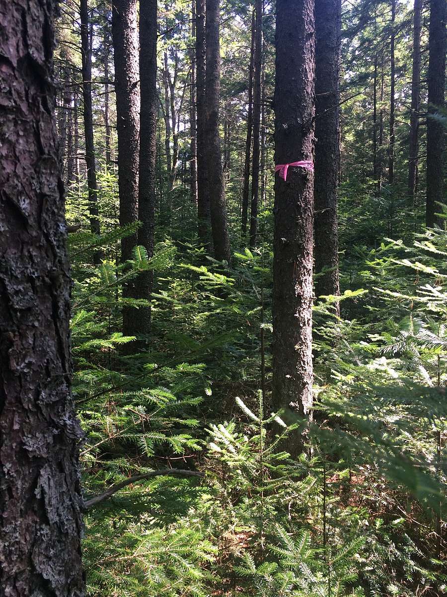 I came back to the office drenched in sweat with mud up to my calves, stinging scrapes on my shins, hemlock needles embedded in my hair, and spider webs plastered to my neck and shirt. I even found a transplant crawling on me as I began to write this. Today I monitored the boundary at Wiessner Woods, a Stowe Land Trust fee-owned property and popular destination for dog walking and cross country skiing depending on the season.