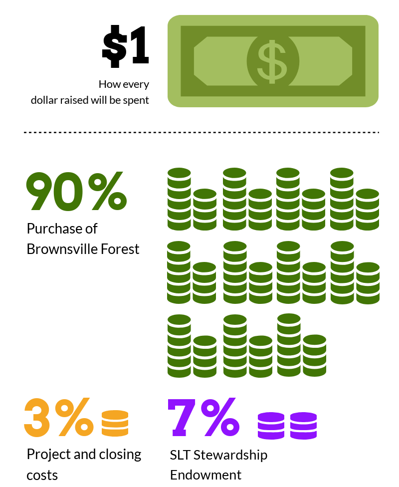 Funds raised through the Brownsville Forest campaign will cover: the $5.5 million acquisition cost of the 750-acre Brownsville Forest, associated project costs, and a significant contribution to SLT’s stewardship endowment.