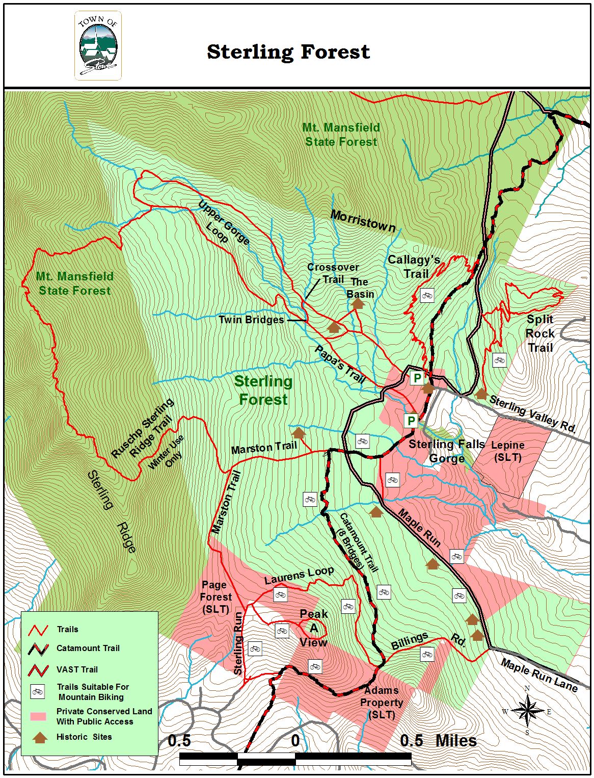 The Adams property can only be accessed by trail from the end of Sterling Gorge Rd. From the intersection of Route 100 and Route 108 in Stowe, travel north on Route 100 for .8 miles and turn left onto West Hill Road. Travel 2.2 miles and continue on West Hill at the sharp right turn where West Hill merges with Percy Hill Road. Continue on West Hill Road to the intersection with Moren Loop. Turn left onto Moren Loop and follow to the intersection with Sterling Valley Road. Turn left on Sterling Valley Road and continue until the left turn for Sterling Gorge Road. Park in the lot to the right of the road before the bridge.